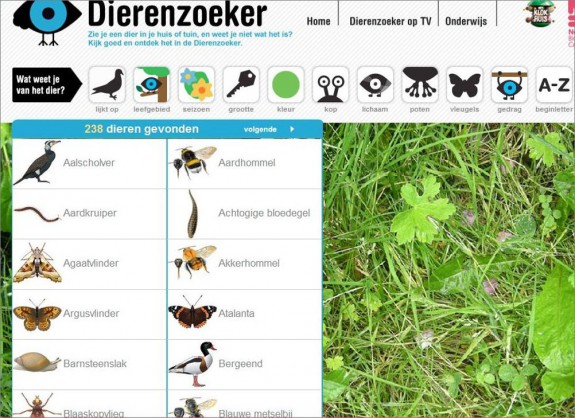 De Dierenzoeker toont een verzameling veel voorkomende huis-, tuin- en keukendieren in Nederland. Via het beantwoorden van vragen over het door jou gevonden dier (bijv. over kleur, gedrag, aantal poten) wordt de selectie dieren steeds kleiner.