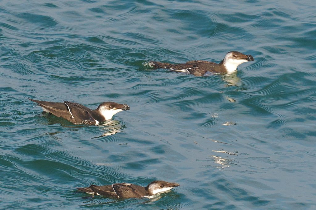 Bovenstaande foto laat drie Alken zien die net achter de blokken op de Maasvlakte opdoken. Het voorste exemplaar is vermoedelijk nog jong: een minder bolle snavel en geen witte strepen erop. De zware snavel en de strepen zijn kenmerkend voor volwassen exemplaren. De vogels zijn in winterkleed, de kleuren minder intens. Het opvallendste onderscheid tussen Alk en Zeekoet zit in de snavel, massief en bol versus lange en scherp.