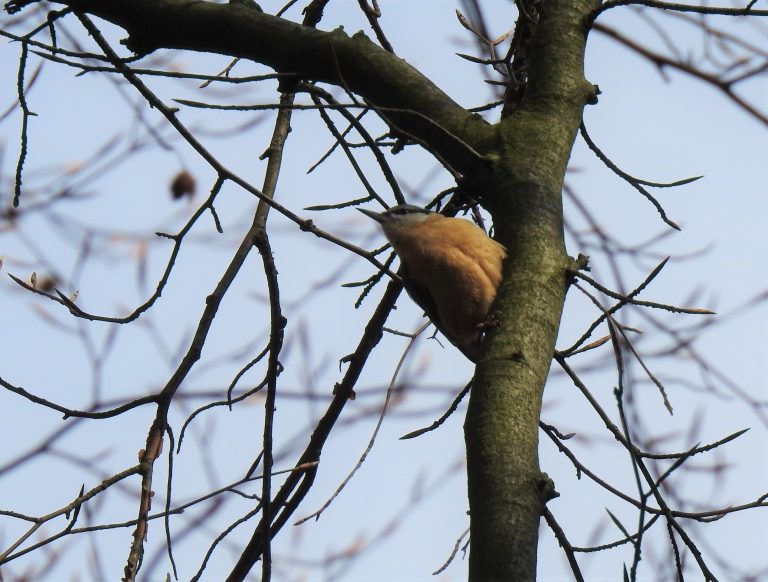 Prachtig om te zien hoe dit gedrongen vogeltje met leiblauwe rug, opvallende oogstreep, witte wangen, korte staart en roestbruine onderkant er met een doppinda in de snavel vandoor ging. Zoiets had ik eerlijk gezegd nooit verwacht van dit mooie vogeltje, dat in de volksmond ook wel “blauw spechtje” wordt genoemd door zijn krachtige snavel en poten. M.b.v. deze poten klimt hij makkelijk omhoog en ook weer omlaag langs een boomstam of tak. Dit i.t.t. de bruine boomklever, die alleen omhoog kan klimmen. In de vogelboeken las ik dat de boomklever op de stam van een boom naar eetbare insecten (kevers, oorwormen, vliegen, insectenlarven in gallen), spinnen, slakjes en op de grond noten (hazel- en beukennootjes en dus ook pelpinda’s) zoekt. Heeft hij een lekker nootje gevonden dan klemt hij die net als een specht tussen een schorsspleet om het met de forse snavel open te hakken. Daarom leven ze voornamelijk in bosrijk gebied en stadsparken met grote oude bomen. Thuis kun je ze het hele jaar zien op landgoed Mildenburg te Oostvoorne in de oude beukenbomen. Al zijn ze daar niet echt talrijk. Op de Veluwe maak je meer kans ze te zien.