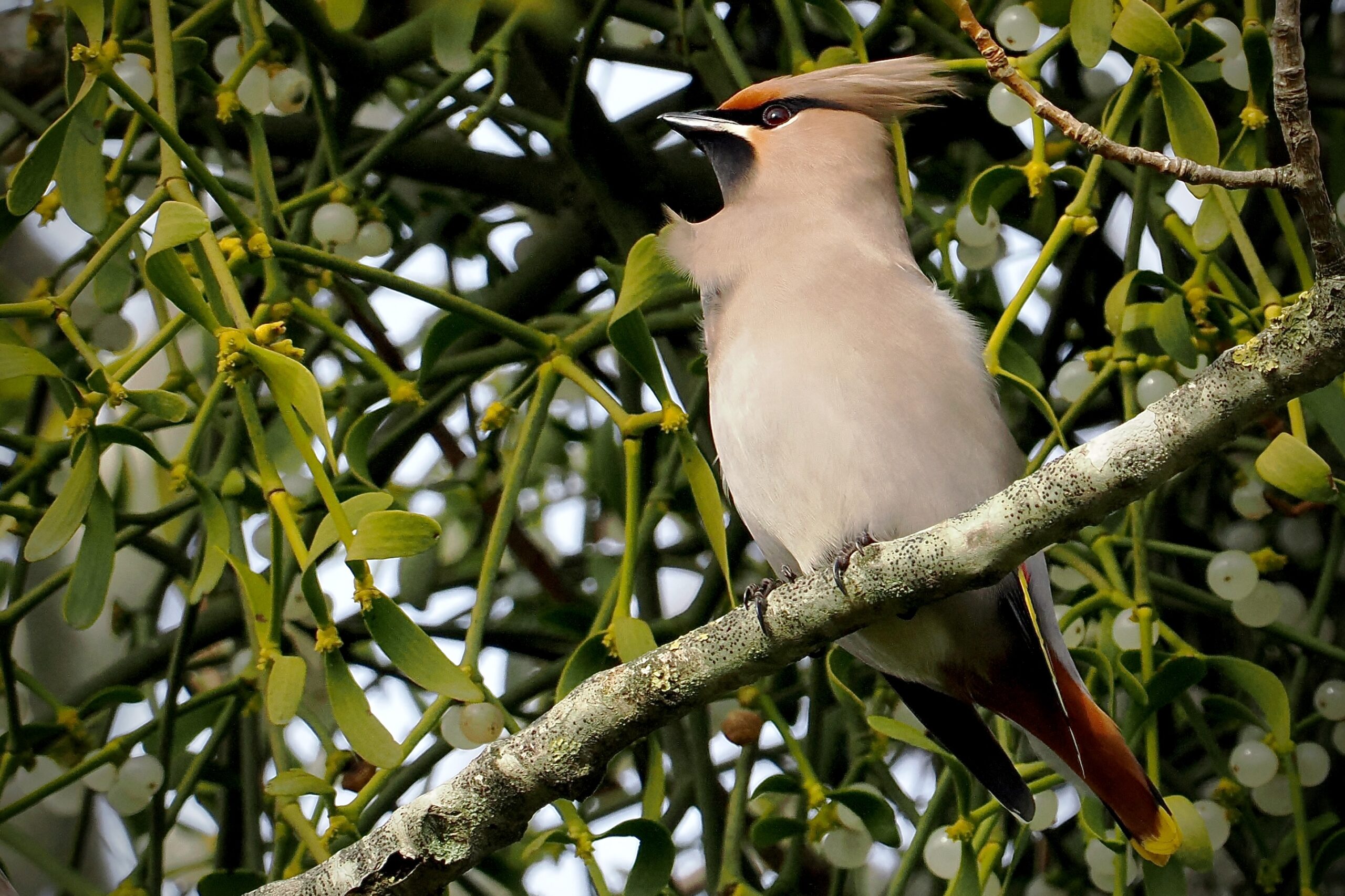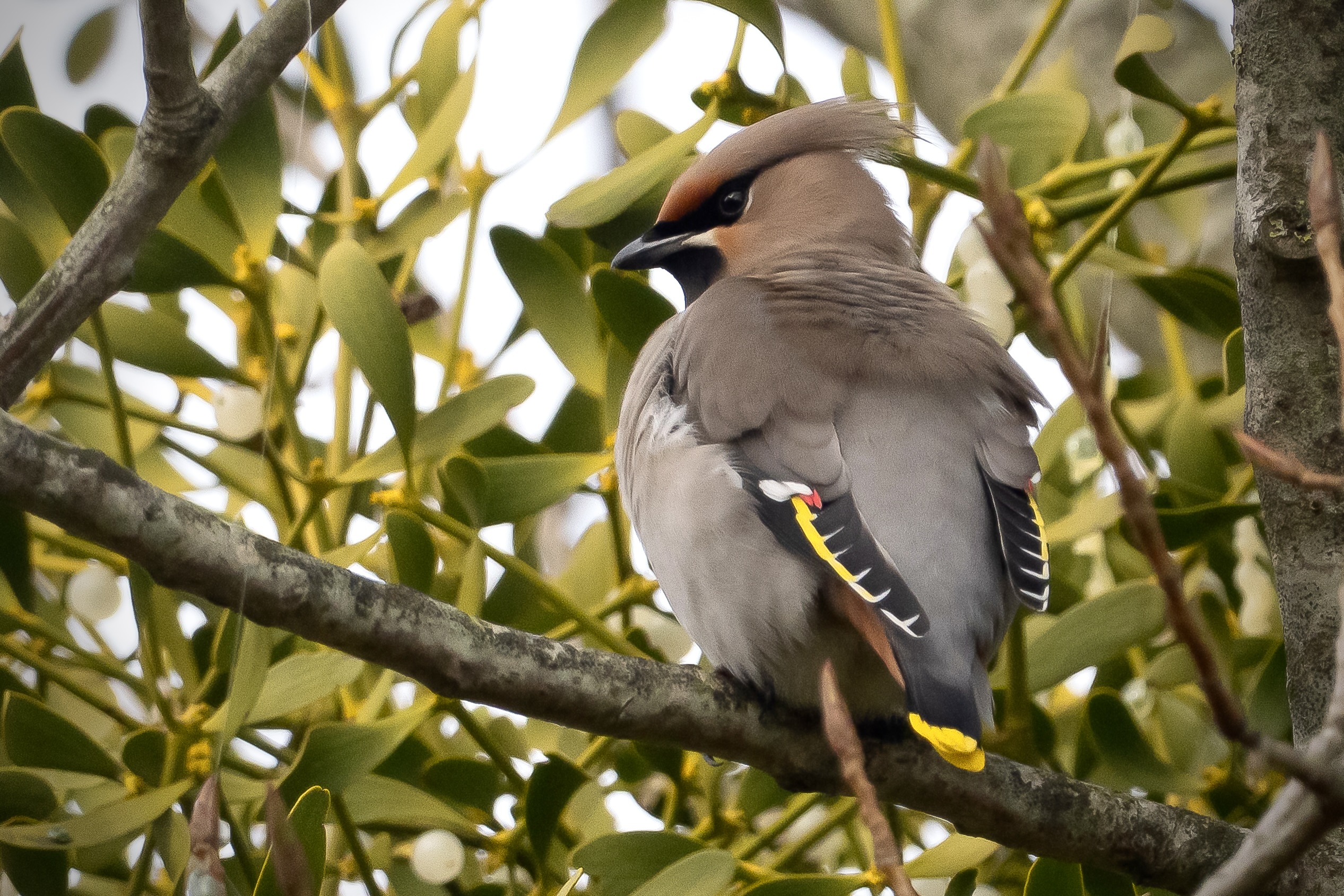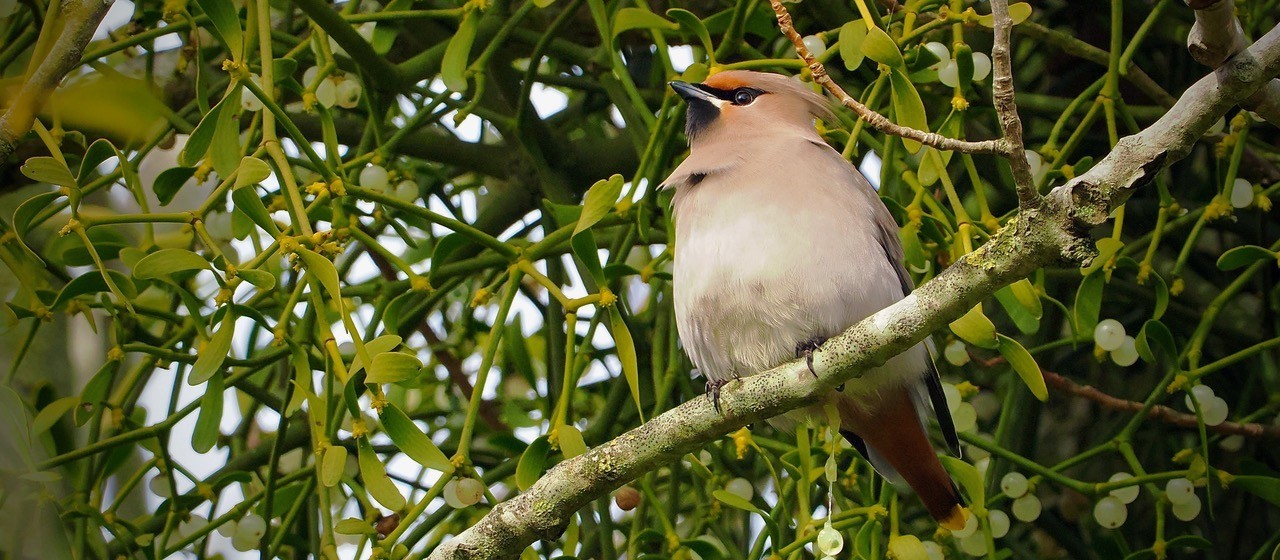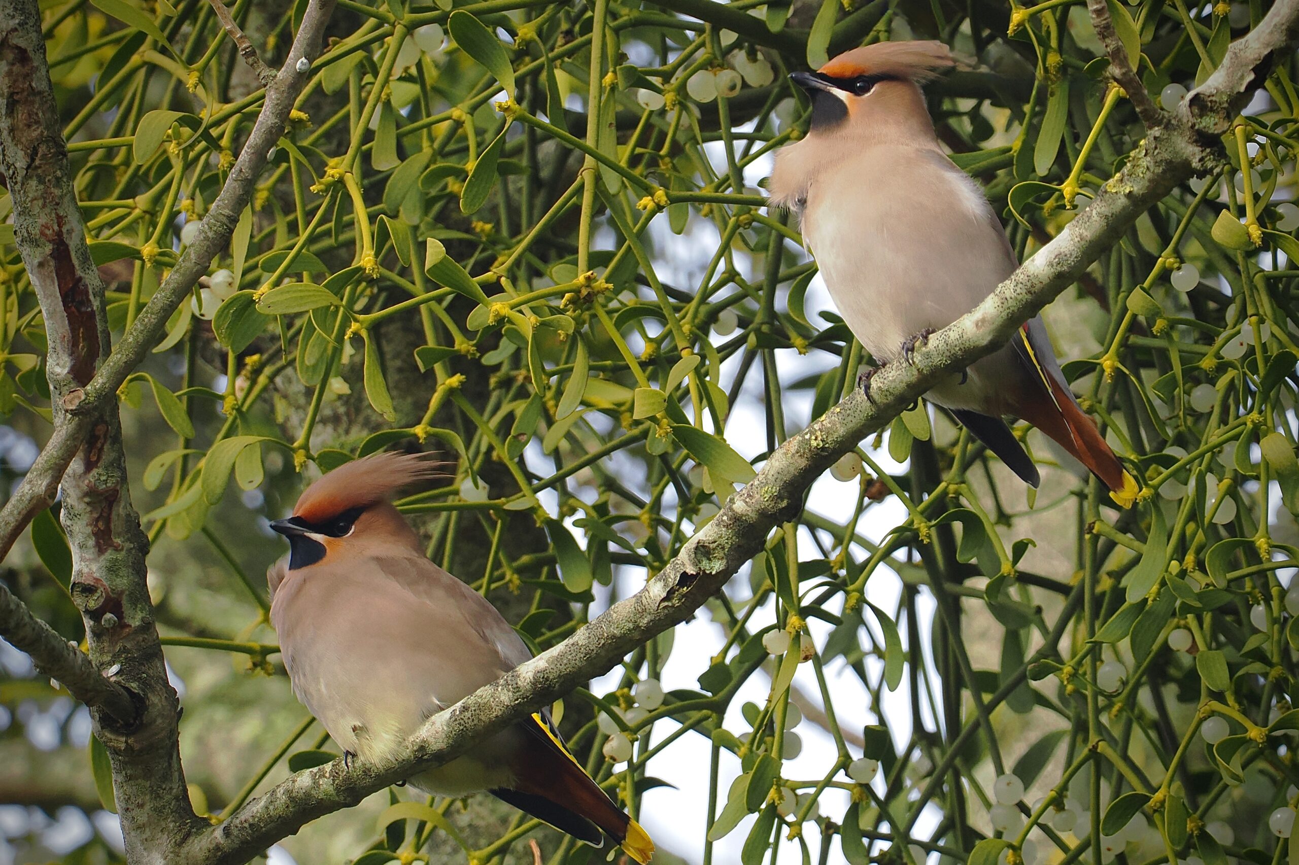 In de wintermaanden staan bessen op het menu, vandaar dat ze ook nogal eens in tuinen worden gezien. Maar in dit geval doen ze zich te goed aan de bessen van de Maretak of te wel Vogellijm, op de foto’s zijn de witte bessen duidelijk aanwezig. Gelukje dat deze halfparasiet hier ooit is geïntroduceerd! De bessen zijn niet bepaald vrij van giften, maar naar het schijnt heeft de Pestvogel een grote lever die de toxische stoffen moeiteloos kan verwerken. Jammer genoeg zijn bij de opnames niet de uitwerpselen van de vogels te zien die soms als een kralenslijm langs de taken hangen. Maretak heet niet voor niets Vogellijm en dankt zijn voortbestaan aan de verkleving van de zaden aan de boom!
