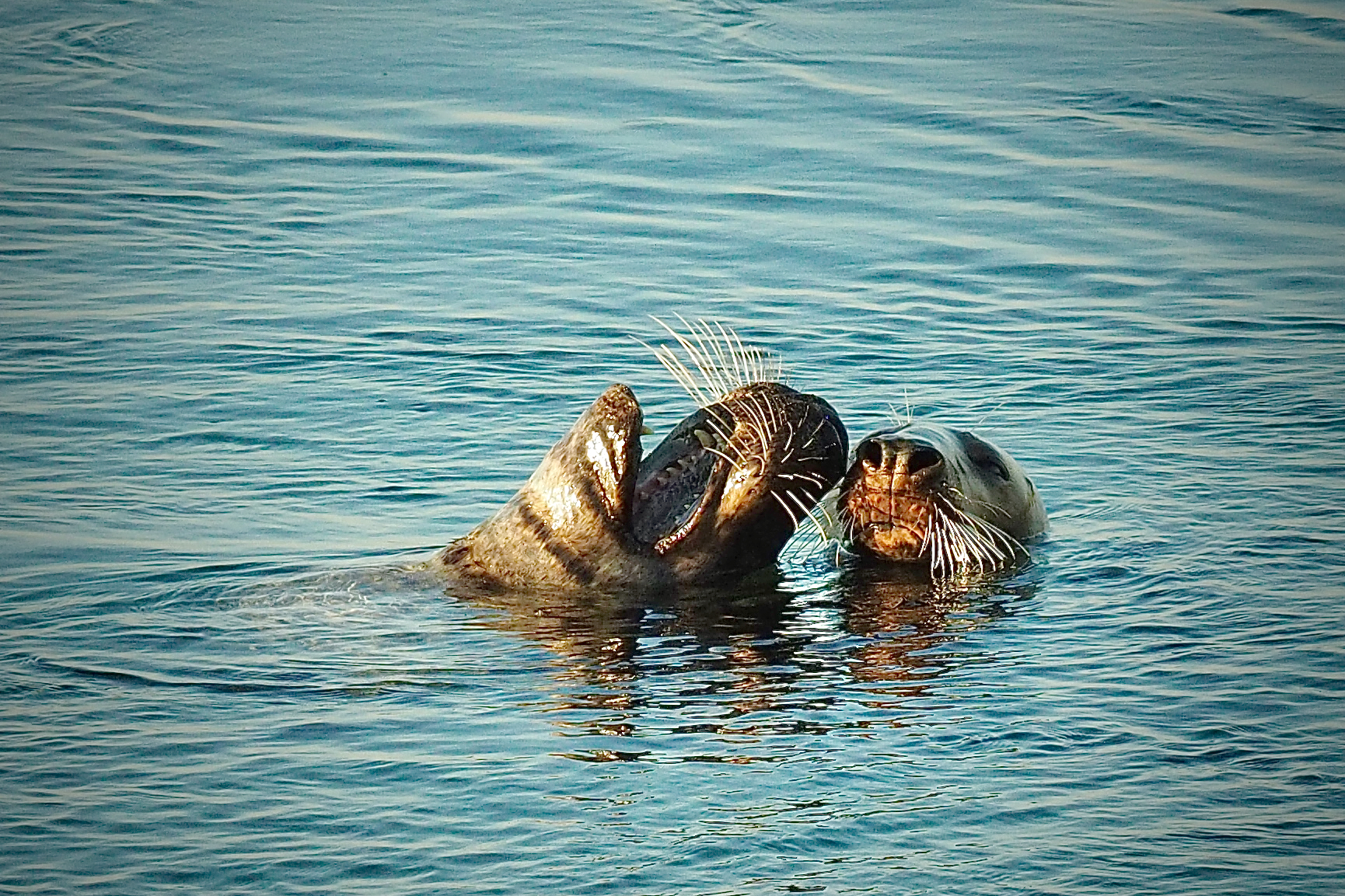 (Volwassen Grijze zeehonden, links een bul, rechts een vrouwtje)