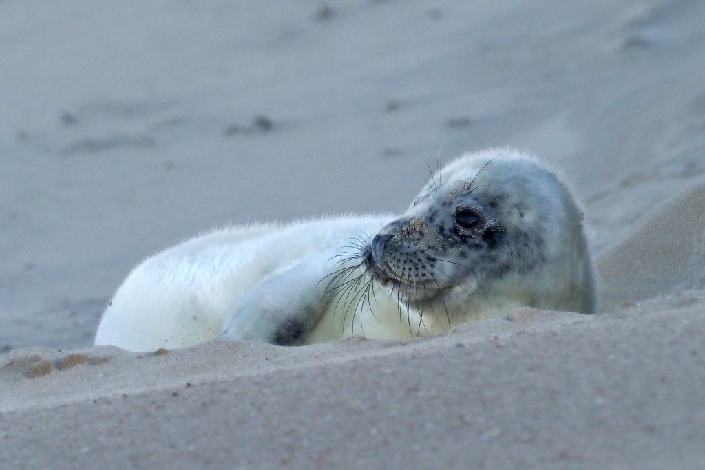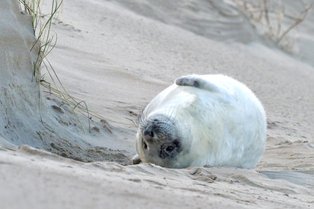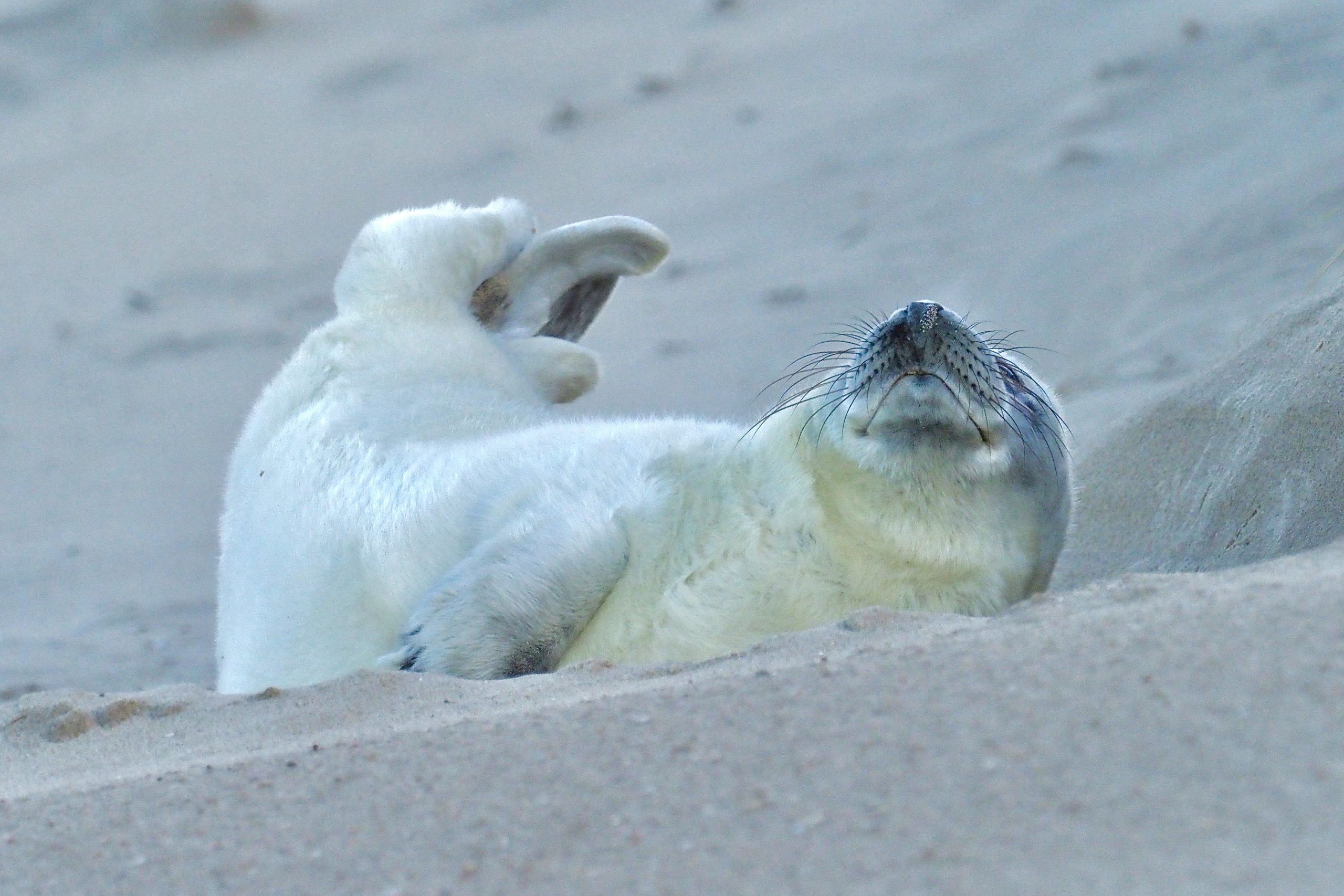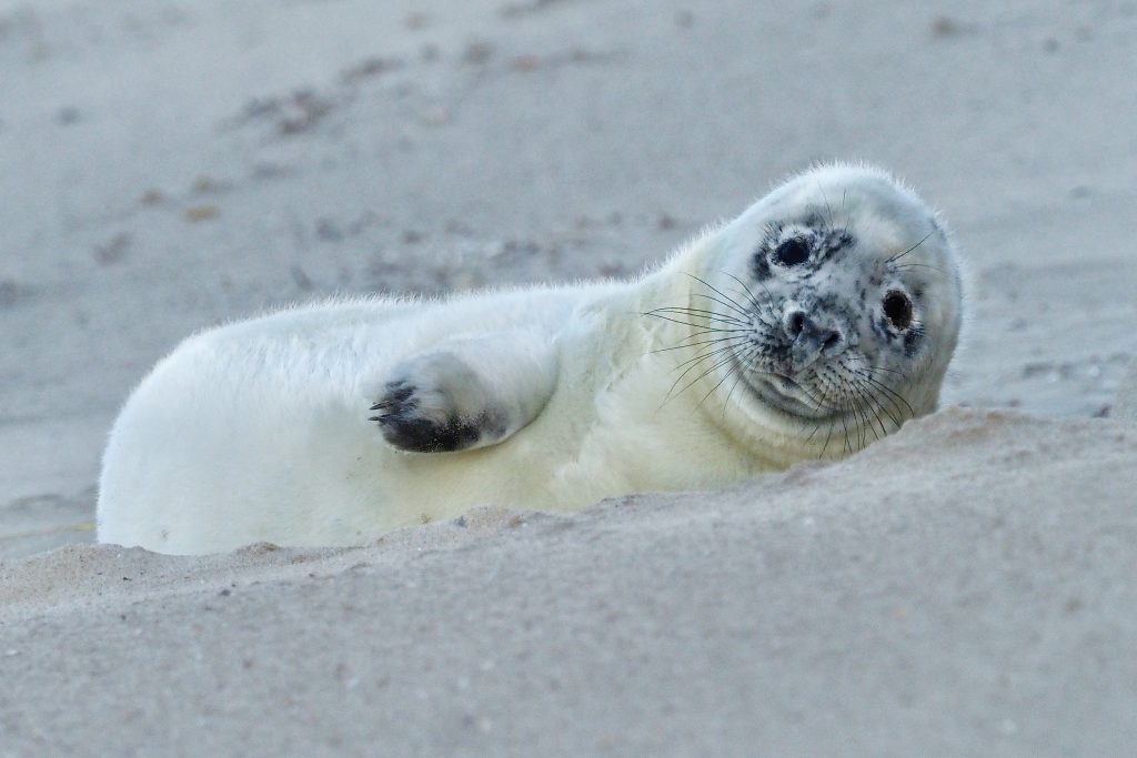 Hoe mooi had het dit jaar op onze stranden kunnen zijn: witte pups in de sneeuw op het strand in de winterzon. Je begrijpt dan de functie van de witte vacht, een goede camouflage voor een jong dat in de wintermaanden geboren wordt, in noordelijke streken, en dan voornamelijk op het strand ligt. Een klein jaar geleden, rond de jaarwisseling hebben we een tijd een aantal ‘witjes’ in de winterzon op het witte zand kunnen volgen. Op afstand nauwelijks opvallend, zelfs zonder sneeuw. Maar nu zijn de vooruitzichten anders. De uitstraling van “wit, fris en vrolijk” is met dit weer veranderd in “nat en beteuterd”