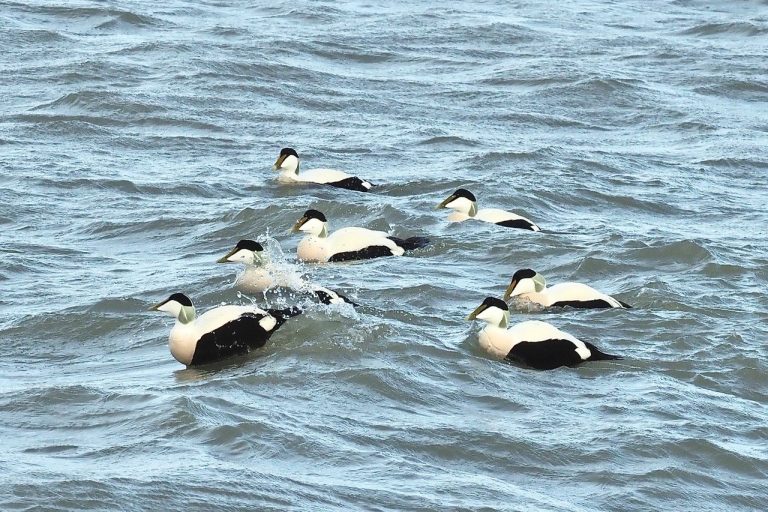 Wat feitjes over de soort. De Eider is met een lengte van 60-70 cm, spanwijdte van 90 cm en gewicht van 2 kilo een grote eend. Ondanks of dankzij dit is het een snelle vlieger met snelheden van > 100 km per uur. Ze zijn laat volwassen en “op kleur”: pas met 4 jaar . Ze kunnen dan ook oud worden: gemiddeld wel 20 jaar. Er zijn zelfs exemplaren bekend van 30 jaar. Toegegeven, een mens wordt ouder, maar die moet 40 jaar werken en 15 jaar naar school, dus wat is de winst?
