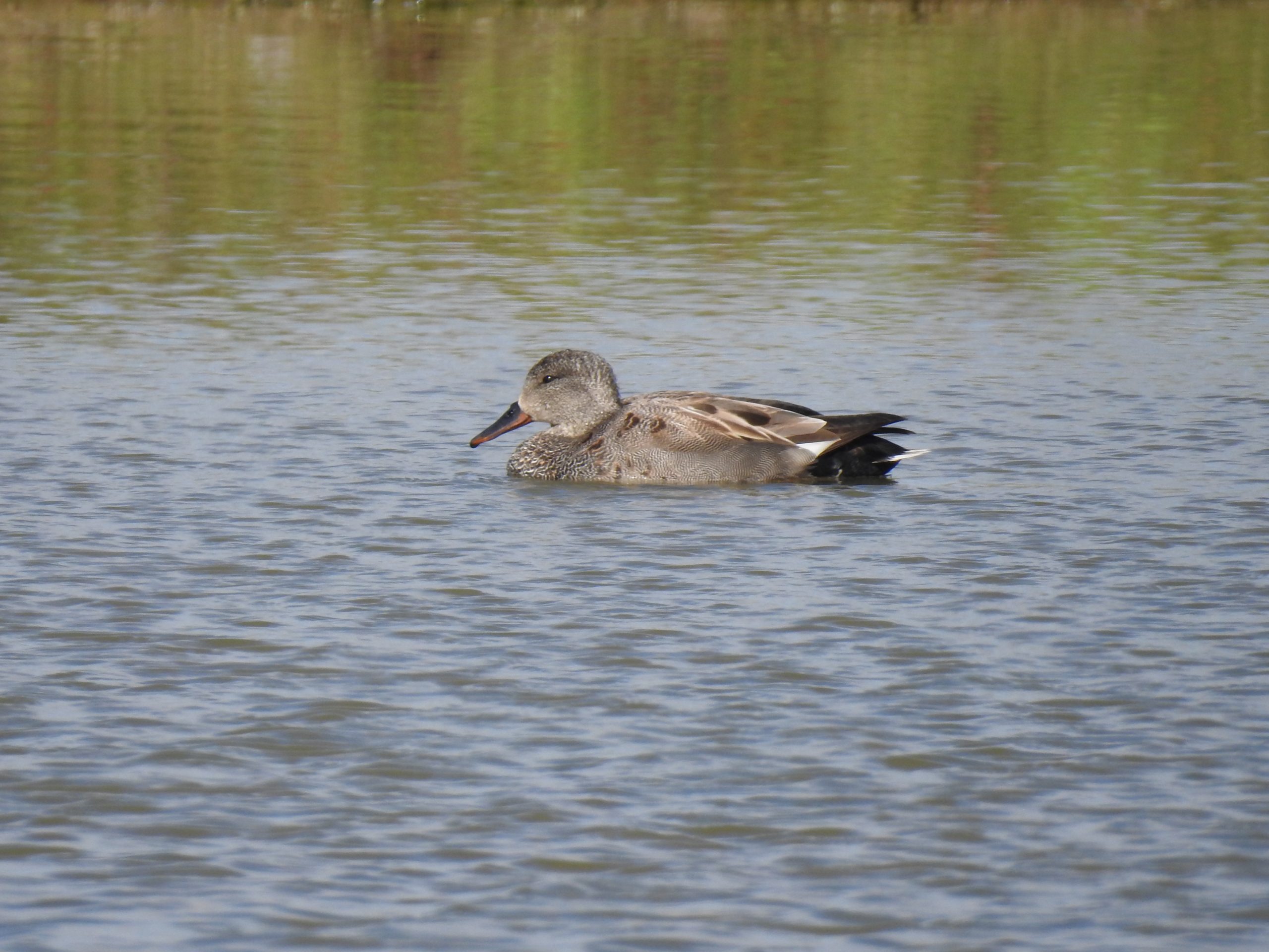 Ja, geen vuiltje aan de lucht tot er op een ochtend een krakeend in onze vijver landde. Het was een woerd en van zo dichtbij kon ik mooi zijn verenkleed bewonderen. Met zijn licht bruine kop, zwarte snavel, borst met geschubde veren, donkere stuit, grijs bruine vleugels met zwart witte spiegel en de witte buik is hij echt een plaatje om te zien. Het vrouwtje krakeend lijkt meer op een wilde eend, maar heeft een witte onderkant en ook een witte spiegel aan de vleugel. Bovendien zijn krakeenden net iets kleiner en eleganter dan wilde eenden.