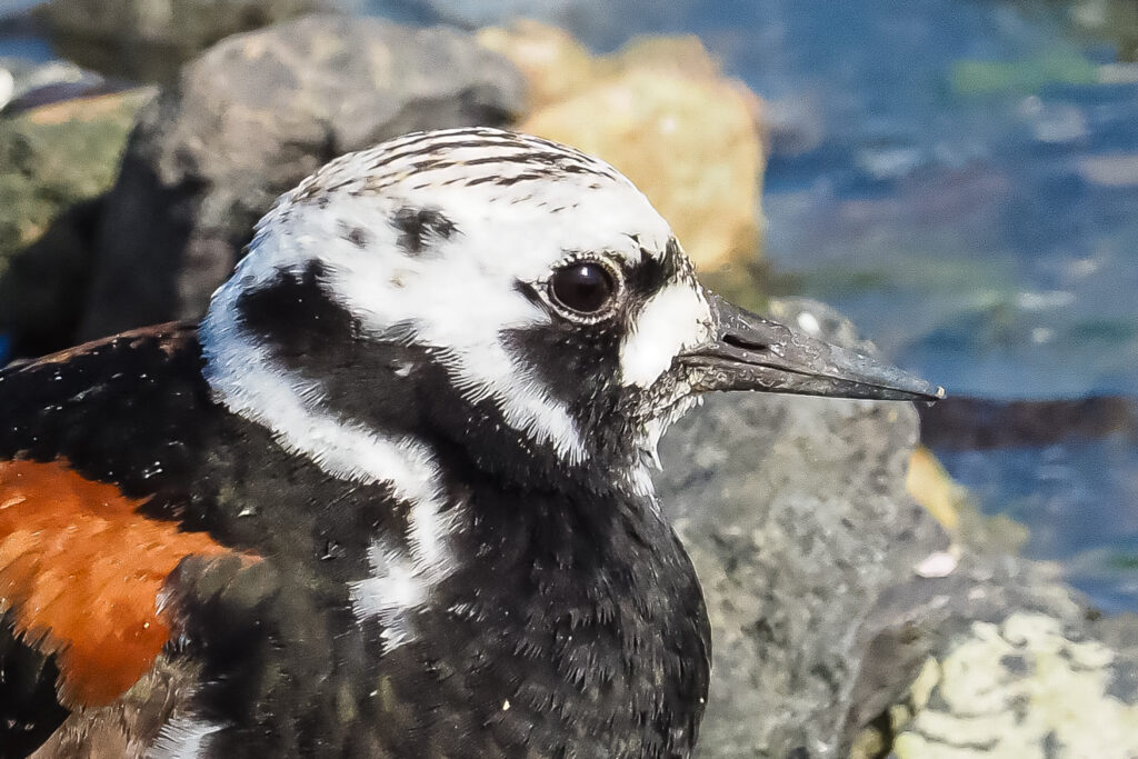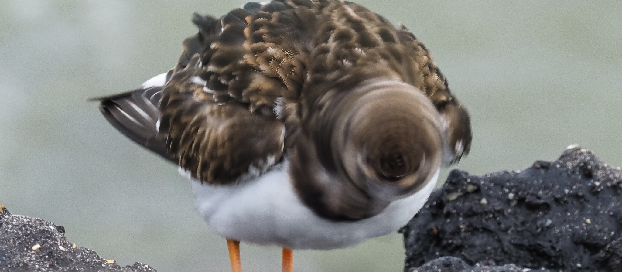 Duizelingwekkend. Aan de oever van de Oosterschelde was op schootsafstand een Steenloper bezig met zijn poetsbeurt. Toilet maken om het wat chiquer te zeggen. De veren werden gepoetst en het lijf geschud om alles weer op zijn plaats te laten vallen. Noodzakelijke actie om de boel in conditie te houden, voor het vliegen, de isolatie en het verwijderen van parasieten. Op moment van afdrukken besloot onze Steenloper de kop droog te schudden. Tegen de snelheid waarmee dat gebeurde was de camera echter niet opgewassen.