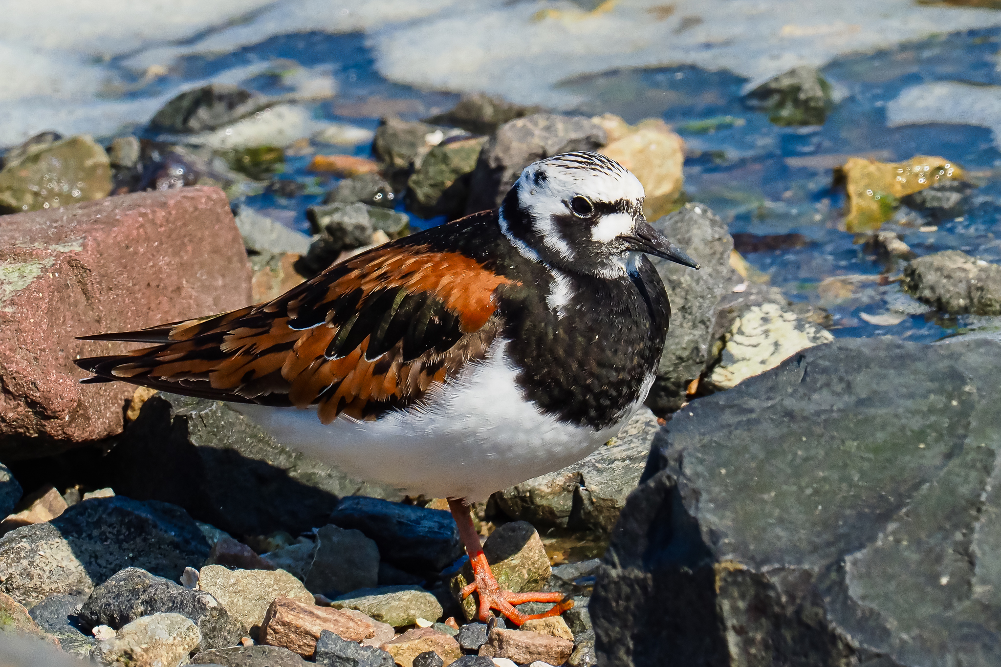 De schutkleur moeten we niet beoordelen op de het winterkleed. Je zou bij deze biotoop zwarte poten en een vale borst inkleuren. Dan wel verwachten dat na verloop van zoveel jaren bivakkeren op onze basaltblokken de poten zwart zouden selecteren. We geloven tenslotte nog steeds in Darwin. Nee, de schutkleur moeten we beoordelen op het zomerkleed. Denk aan noordelijke toendra’s en rotsachtige, begroeide kusten. En dan is zo’n opvallend oranje, witzwarte vogel ineens onopvallend.