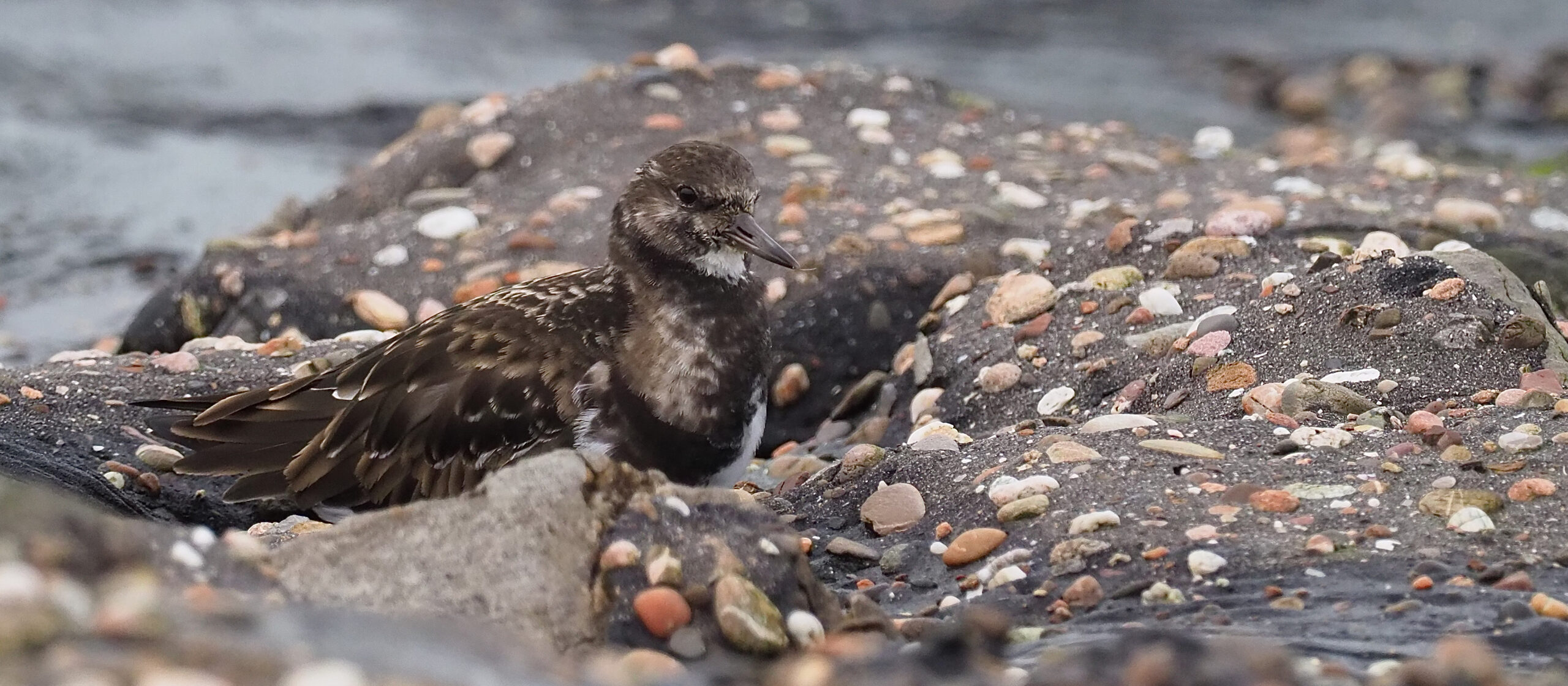 Geen mooie opname om een vergelijk te maken met de soortgenoot in zomerkleed hierboven. Even later dacht ik beet te hebben met een vogel weggedoken tussen de stenen van de kustwering. Bijna onzichtbaar, zeker voor een oppervlakkige kijker. Eenzelfde Steenloper als hierboven, maar dan in winterkleed en in dekking: