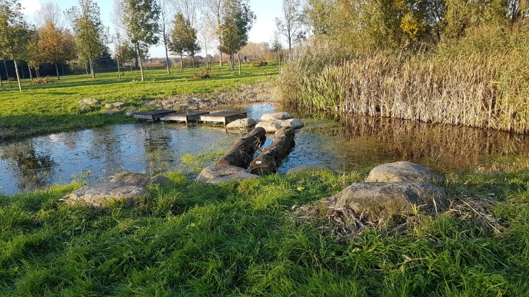 Wanneer je het bos inloopt, bevindt zich aan de linkerkant een grote poel waar het in en rond het water bruist aan een verscheidenheid van dieren en planten. Verschillende waterdiertjes, juffers en libellen maar ook riet en de lisdodden tieren er weelderig. Even verderop richting de brug naar het fiets/ wandelpad staat een insectenhotel wat een onderdak bied aan verschillende insecten.