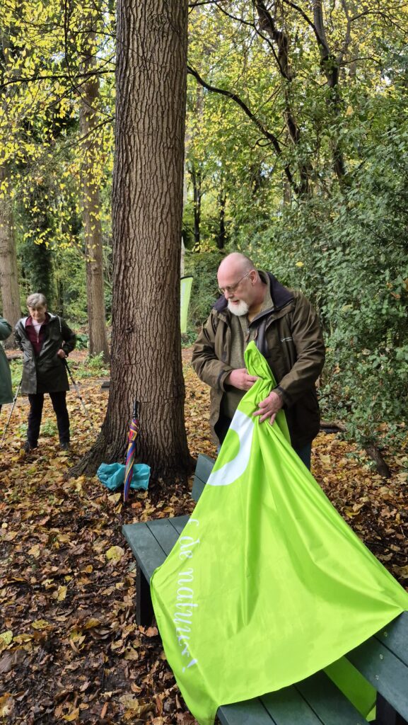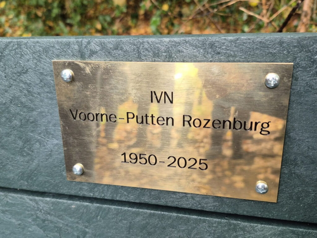 Het bankje is een geschenk van IVN Voorne-Putten Rozenburg aan het Zuid-Hollands Landschap ter gelegenheid van de jarenlange intensieve onderlinge samenwerking én ons 75-jarig bestaan.