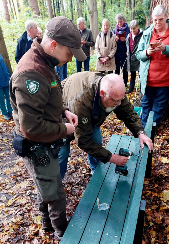 Met behulp van de schroefboormachine van boswachter Bas en onder het toeziend oog van alle aanwezigen werd door Albert een gedenkplaatje op het bankje geschroefd.