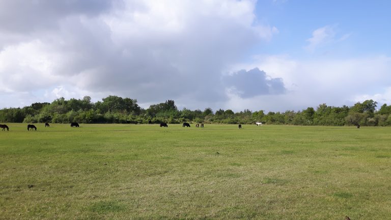 Groene weide met grazende paarden, omgeven door bomen en onder een bewolkte hemel.