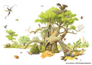 Jeroen Helmer (1962) studeerde in 1989 af aan de St Joost Kunstacademie in Den Bosch en vond daarna zijn levensmissie als illustrator, ecoloog en verhalenverteller bij ARK Rewilding Nederland. ARK geeft al 36 jaar ruimte aan natuurlijke processen zoals het vrij meanderen van beken en rivieren, natuurlijke jaarrondbegrazing, de invloed van roofdieren en kringloopprocessen. Dat Nederland een groot stadspark zou zijn, is een misvatting waar Jeroen korte metten mee maakt. Zijn ecologische vergezichten zijn op veel plekken in ons land al realiteit geworden.