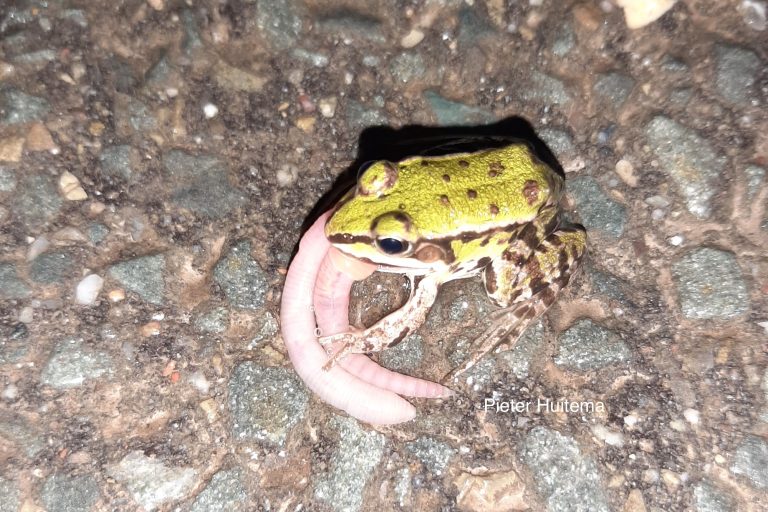 Foto: Kikker eet wormen tijdens oversteek bij Acquoysemeer. Piet Huitema
