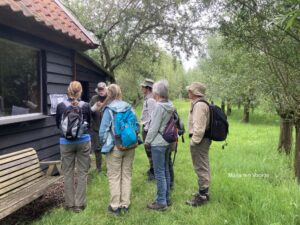 Uitleg over de eendenkooi bij de werkschuur van de Bisschopskooi. Marja ten Voorde