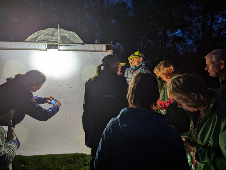 Naarmate het langer donker was kwamen er meer vlinders op het doek. Veel aanwezigen hielpen met apps op hun telefoon om de soorten op naam te brengen. Het hoogtepunt vormde de rietvink, een vrij grote nachtvlinder met warme oranjebruine kleuren, die vanaf 23.00 uur verscheen. Uiteindelijk vertrokken tegen middernacht de laatste deelnemers moe maar zeer voldaan naar huis.