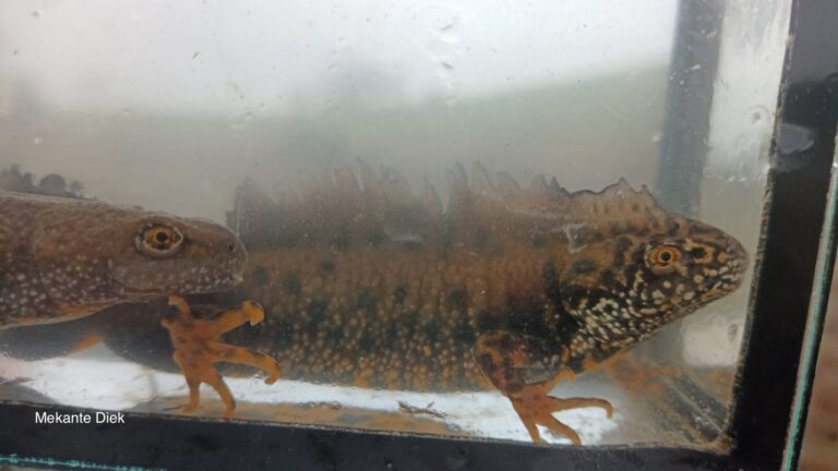 Foto: Kamsalamanders worden verplaatst naar hun nieuwe leefomgeving. Mekante Diek