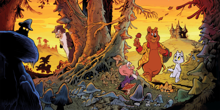 In de verhalen over Olivier B. Bommel en Tom Poes van Marten Toonder komen veel paddenstoelen voor. Je ziet ze vaak als sfeermakers in de prachtige natuurtekeningen. In het bijzonder als het herfst is, maar ook als er magie aan de orde is. Ook zijn schimmels zoals ‘draadhippel’ dikwijls aanwezig in scènes waarin de natuur ‘naar de verturving gaat’.