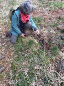 Gewapend met twee grondboren gingen we op pad onder leiding van Guido Nijland. De eerste boring deden we langs het bospad dat naar het Vrouwenveld leidt. Na elke boring, die we zorgvuldig in een PVC-goot legden werd de mooie opbouw van de bodem steeds meer zichtbaar. Guido leerde ons hoe je een nette grondboring maakt, waar je op kan letten en wat je er allemaal uit af kan leiden. De tweede en derde boring deden we op het heideterrein, dicht bij elkaar, maar door een klein hoogteverschil zag je toch duidelijke verschillen in dikte van de zandlaag. Heel interessant om de uitleg van Guido daarbij te horen. Tot slot deden we nog een boring in het veen (ooit afgeplagd), daar was de bodem nauwelijks ontwikkeld en zaten we al snel op de laag ingewaaid stuifzand.