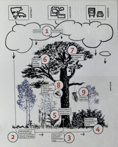 Even verderop ontstaat er een mooi gesprek tussen de aanwezige gidsen over hoe we dit beeldend kunnen maken in excursies en wat de beste toon is om die boodschap te brengen. Belerend een verhaal over het milieu afsteken is zeker niet wat wij als IVN zouden willen. Gedacht wordt aan spelvormen met elementen zodat de cyclus in beeld gebracht kan worden. Of hele praktische vragen stellen als “wat kunnen wij zelf elke dag doen om een beetje bij te dragen aan minder uitstoot”. Bij excursies op de fiets komen ipv met de auto en zelf het goede voorbeeld geven.