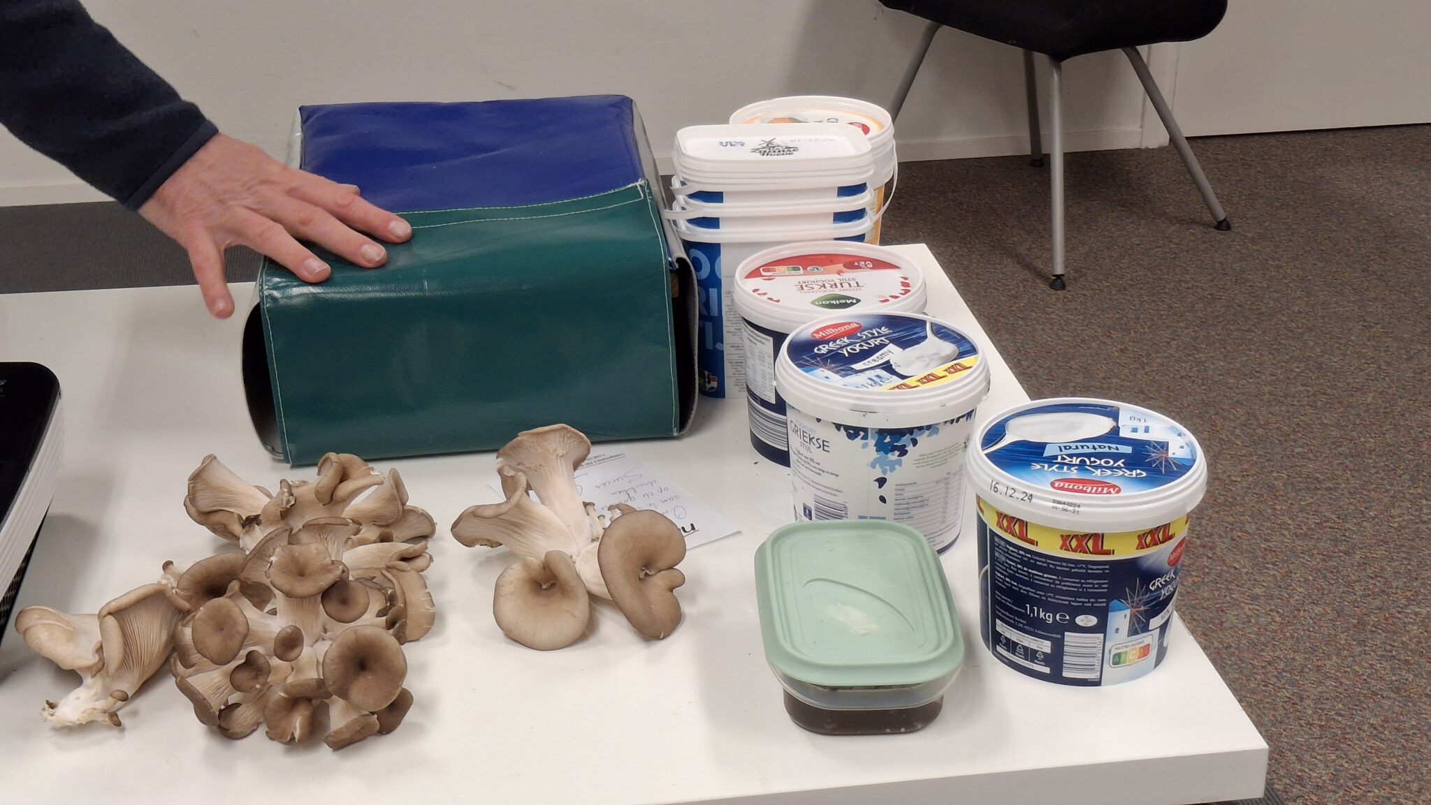 Om het principe te leren kennen en ervaren krijgen alle aanwezigen de mogelijkheid om broed (brokje oesterzwammen mycelium) te mengen met vers koffiedik in de zelf meegebrachte afsluitbare bakjes. Na een periode van eerst warm en donker (= groei schimmels) en bijvoeren met koffiedik, komt de tweede fase van koud en licht, waarna de vruchtlichamen van het mycelium zich naar buiten werken via 2 pinkdikke gaatjes in het deksel. En dan …..smullen maar.