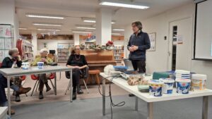 Op 28 november vonden 40 deelnemers een plaatsje in de bibliotheek van Vledder om te luisteren naar Wiebe Lamsma van de Versnellingshoeve ‘t Kiemt. Deze organisatie is gericht op het onderzoeken en ondersteunen van initiatieven op het gebied van de circulaire economie. Hoe zorg je er met elkaar voor dat je zo min mogelijk nieuwe spullen nodig hebt, dat deze spullen en voedsel dichtbij worden geproduceerd en verkocht, en dat restproducten zoals bouwmaterialen, appelpulp en wolresten zinvol hergebruikt gaan worden. Een boeiend en uitdagend verhaal met uitwisseling over hoe je ook zelf bij kunt dragen door bijv. groenten te kweken.