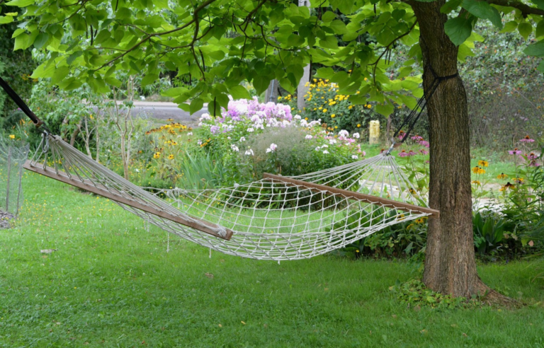 Kennelijk ben ik aartslui als dat liggen me zo aanspreekt. Maar soms moet er in een tuin iets gebeuren en daar beleef ik toch ook wel lol aan. Een ander boek dat ik met plezier lees gaat over noeste arbeid in de moestuin. ‘Groentje in de moestuin’ van Alma Huisken en Doortje Stellwagen helpt om bewondering te krijgen voor tuiniers die op natte kleigrond werken. Met veel humor en mooie recepten maken ze het nog aantrekkelijk ook! Het grote genieten beleef ik toch vooral als ik vanuit de hangmat het resultaat van mijn werk mag bekijken. Als ik de hommels en de bijen en de vogels hoor. Ik realiseer me dat de grote herfstschoonmaak van de tuin die vroeger gebruikelijk was niet meer hoeft. Sterker nog, vanuit het oogpunt van de tuin is al dat opruimen schadelijk. Er moet ruimte zijn voor schuilplaatsen van allerlei tuinbewoners, van egels tot hommels tot overwinterende spinnen en slakken.