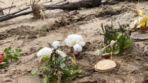 Na een half uur flink werken begon het wat te miezeren. Iedereen werkte door totdat het begon te plenzen. Gelukkig stond er koffie en thee klaar en uiteraard voor de kinderen limonade. De kinderen die uitgewerkt waren, maakten met elkaar een mini esdorp. Schapen van wol, hutjes van takken en het werd een mooi geheel. Na een vervoegde lunch met soep ging een grote groep uiteindelijk toch weer aan de slag tot 14.00 uur.