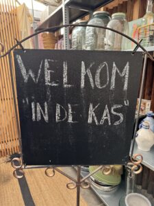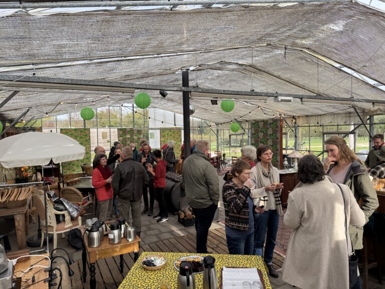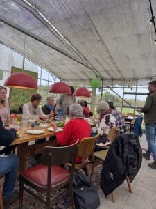 We werden ontvangen om 10.00 met koffie en lekkers in de kas van de Tuinen van Frederiksoord. Deze tuinen liggen in het hart van de Koloniën van Weldadigheid. Sinds kort zijn De Tuinen weer open en toegankelijk voor iedereen. In de Tuinen van Frederiksoord vind je De Fruithof, De Tuin zonder Drempels en de Tuinbouwschooltuin. Het is een prachtige plek en bijzonder om daar te starten. Het weer was deze dag best fris en binnen in de kas was het warm en gezellig. Esther had heerlijke koek gebakken voor bij de koffie en de biologische en vegetarische lunch was uitgebreid en erg lekker. In de kas, op De Tuinen in Frederiksoord, is Esther Viool eigenaar van pop-up eetcafé ‘In de kas’.