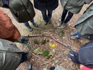 Met zo’n 12 deelnemers gingen we in groepjes op weg naar het Sterrebos, ingedeeld aan de hand van uitgereikte dennenappels van diverse formaten: van kingsize tot mini.