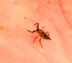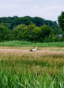 Bovenwater zagen we op oeverplanten parende liesgrasrietkevers, een zwartpootsoldaatje vloog op onze lunchtafel en op het water langs de oever probeerde een poelpiraat zich uit de acht poten te maken voor de enthousiaste kinderen. Maar de ooievaar verderop trok zich nergens wat van aan en stapte parmantig verder door het hoge gras.