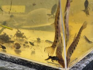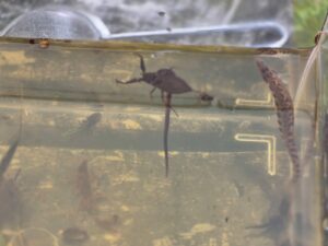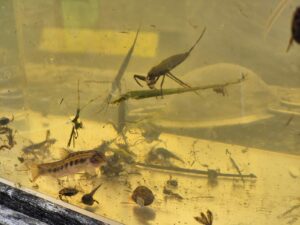 Al snel werden vijf kleine modderkruipers gevangen, de gevlekte Amerikaanse rivierkreeft kon rekenen op véél belangstelling. Verscheidene wantsen troffen de kinderen aan: een staafwants, waterschorpioenen, een platte waterwants en een gewoon bootsmannetje. Verder larven van echte libellen en juffers, larven van waterkevers zoals de Tuimelaar die ook als volwassen kever werd gevangen. Enkele larven van een amfibie, vermoedelijk van salamanders, vonden we ook. Ook vingen we enkele weekdieren: grote diepslakken en kleine tweekleppigen die tot de hoornschalen en erwtenmossels behoren. Ook kleine ovale waterkevertjes zwommen snel door het water, het zijn gewone snelzwemmers. Verder nog bloedzuigers (erpobdella, vermoedelijk de achtogige bloedzuiger), een haftenlarve (?) en een watermijt.