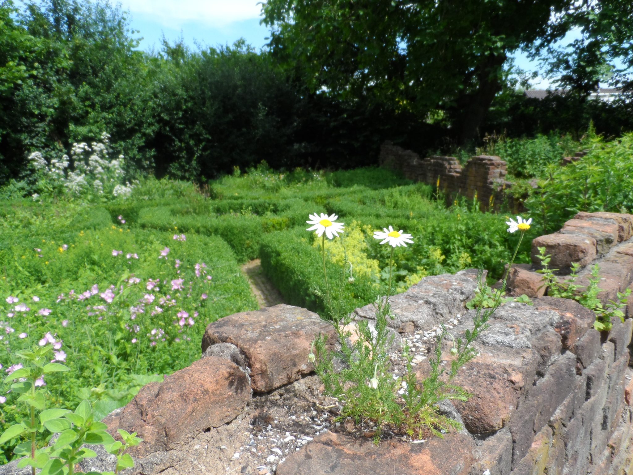 Gelijktijdig zijn in de revitalisering de indeling van de plantvakken gewijzigd. In twee vakken staan kruiden die we gebruiken voor het kleuren van wol, voor het met geur bestrijden van muggen bijvoorbeeld, of om een lekkere geur in het beddengoed te brengen. Daarna komen twee vakken waar keukenkruiden staan: kruiden voor in salades, voor in stoofschotels en om thee te trekken. In een kruidenspiraal laten we ieder kruid op een perfecte plek groeien (meer of minder vochtig/ meer of minder zon). Tot slot staan er in twee vakken kruiden die we kunnen gebruiken voor onze gezondheid. In het midden dus, in de honingraat, staat een botanische roos, tijdens de bloei een echte geurverspreider, voedselleverancier voor insecten en na de bloei, met bottels interessant voor vogels.