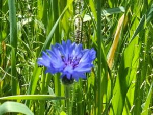 Op de Graanakker stond de de Herik stond als eerste in bloei; daarna ook volop Klaproos en Bolderik. En het blauw van de Korenbloem. Ieder jaar zaaien we in het najaar drie granen mee met de akkerbloemen.