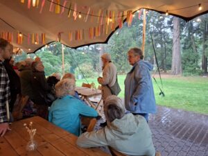 Om 14.00 uur kwamen we met 18 verenigingsleden bij elkaar in de gezellige schuur achter de receptie. Na de koffie of thee nam gids Bert ons mee voor een wandeling tussen de bomen. Helaas hield de regen zich niet aan de verwachtingen en werd er onderweg een enorme hoeveelheid water over ons uitgestort. Gelukkig stonden we toen net onder de bescherming van de tent. We sloten af met een drankje en een hapje. De wandeling was door de regen wat korter dan de bedoeling was, maar de gezelligheid en de contacten tussen de aanwezige leden waren er niet minder om.