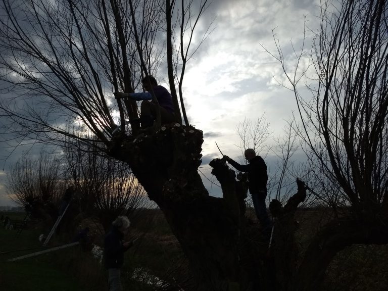1e van deze maand zorgden zo’n 16 knotters dat de bomen achter Jannigjeshof aan de Langbroekerdijk werden geknot.