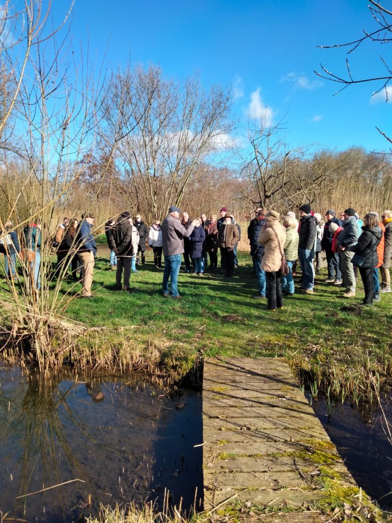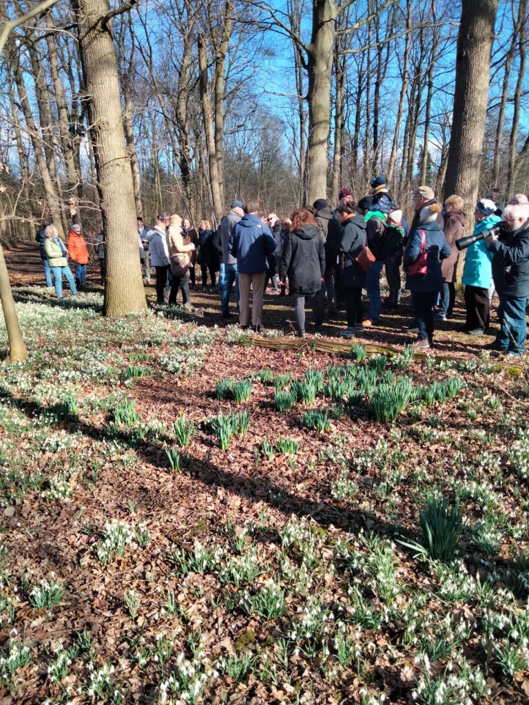 Op deze zonnige midden gingen de deelnemers in twee groepen naar het normaal afgesloten stiltegebied. Daar staan duizenden sneeuwklokjes in bloei, een lust voor het oog. De gidsen vertelden ook over het beheer van het landgoed en de flora en de fauna.