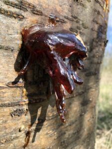 Wanner een kersenboom beschadigd raakt, bijvoorbeeld doordat er door storm een tak uitbreekt, kan de boom gaan bloeden of gommen. Er stroomt dan een soort hars uit de wond die later stolt tot een doorzichtige, plakkerige substantie. Deze gom zorgt voor het afdichten van de wond en beschermt de boom tegen indringers. Als een kersenboom gomt zonder dat er uiterlijke beschadigingen zijn en als de hars blijft stromen, dan kan de boom ook lijden aan de gomziekte. De ziekte wordt veroorzaakt door een bacterie die binnen in de boom beschadigingen maakt waardoor de boom gaat gommen.