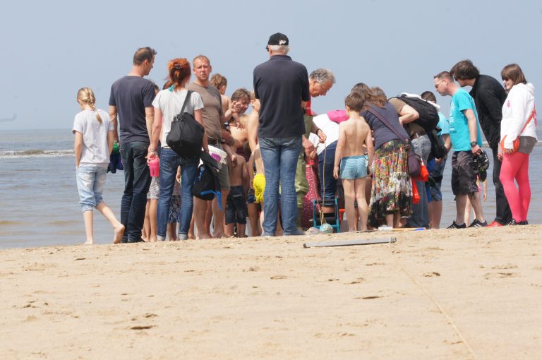 Een kor is een sleepnet dat we met zijn allen, lopend op het strand langs de vloedlijn, voorttrekken. Daarna kijken we samen met de gidsen wat allemaal hebben ‘gevangen’.