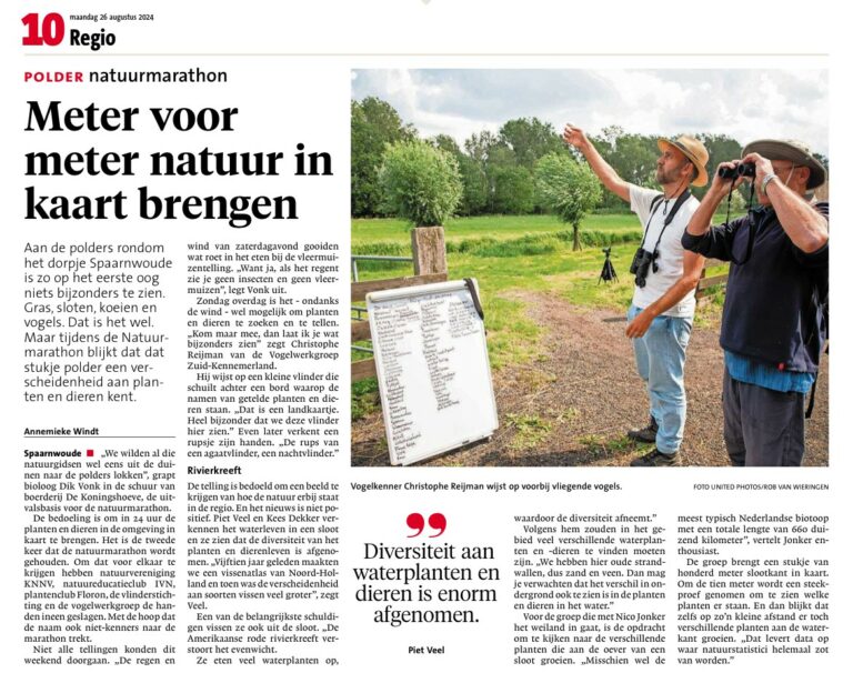 De Natuurmarathon van IVN, VWG en KNNV in Zuid-Kennemerland op Boerderij Koningshoeve was wederom (hij werd voor de tweede keer gehouden) een succes. De natuurmarathon wil de aandacht vestigen op biodiversiteit. In de diverse inventarisaties zijn rond de 400 soorten geteld op een speciale pagina van Waarneming.nl.