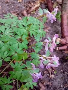 Er was al veel bloeiends te zien. Zo zagen we de gele bloemen van het speenkruid, verschillende soorten narcissen en de zeer zeldzame gele anemoon. Het wit van de sneeuwklokjes was bijna verdwenen, maar het wit van het armbloemig look kwam al om de hoek kijken. Het paars van de vingerhelmbloem en van de waarschijnlijk recent geplante sneeuwroem schitterde onder de nog kale bomen.