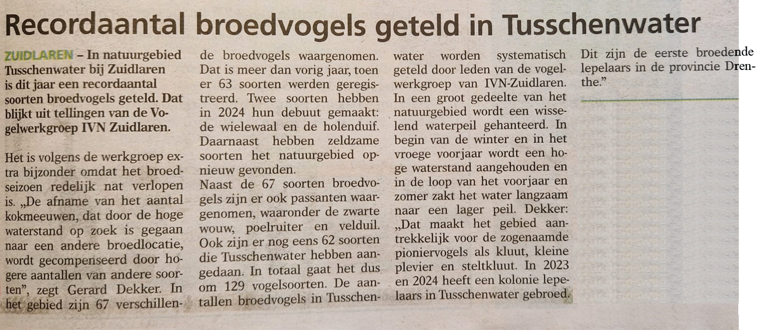 De inventarisatie van de broedvogels van Tusschenwater door leden van de vogelwerkgroep heeft weer interessante gegevens opgeleverd.