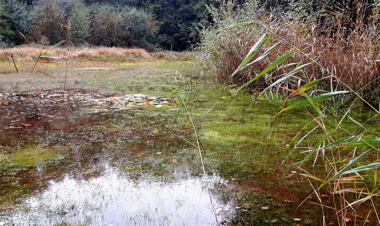 We trotseren een glibberig paadje en al snel krijgen we het ven in het vizier: er ligt een lichtgroene waas in het water. Even is er schrik: het zal toch niet Watercrassula zijn, die invasieve vijversoort die, eenmaal geworteld, bijna niet meer weg te krijgen is en alle inheemse planten in zijn omgeving overwoekerd. Gelukkig kunnen we constateren, dit is Vlottende bies!