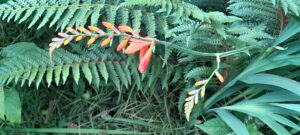 Verrassing 3: twee MONTBRETIA’S die fel-oranje uit het omringende groen knallen. Hoe komen die daar??