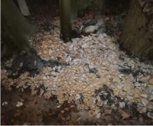 Op de Zomp heb ik op 23 oktober 2022 de eerste Honingzwammetjes waargenomen (zie foto links). Precies een week later was de zwam dankzij het warme vochtige najaarsweer een grote zee van kleffe paddenstoelen geworden compleet met een witte waas van zwameters (schimmel). Zie foto rechts die door Daan een week later is genomen. Dit geeft meteen een beeld hoe vergankelijk een paddenstoel kan zijn.