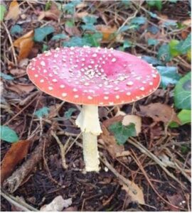 Vliegenzwam. Dit is een paddenstoel die we allemaal kennen als de rode paddenstoel met witte stippen.