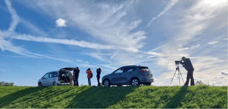 De lucht was prachtig gekleurd en steeds zagen we weer een lange streep vogels, massa’s, genieten was het, een mooie afsluiting van de excursie.