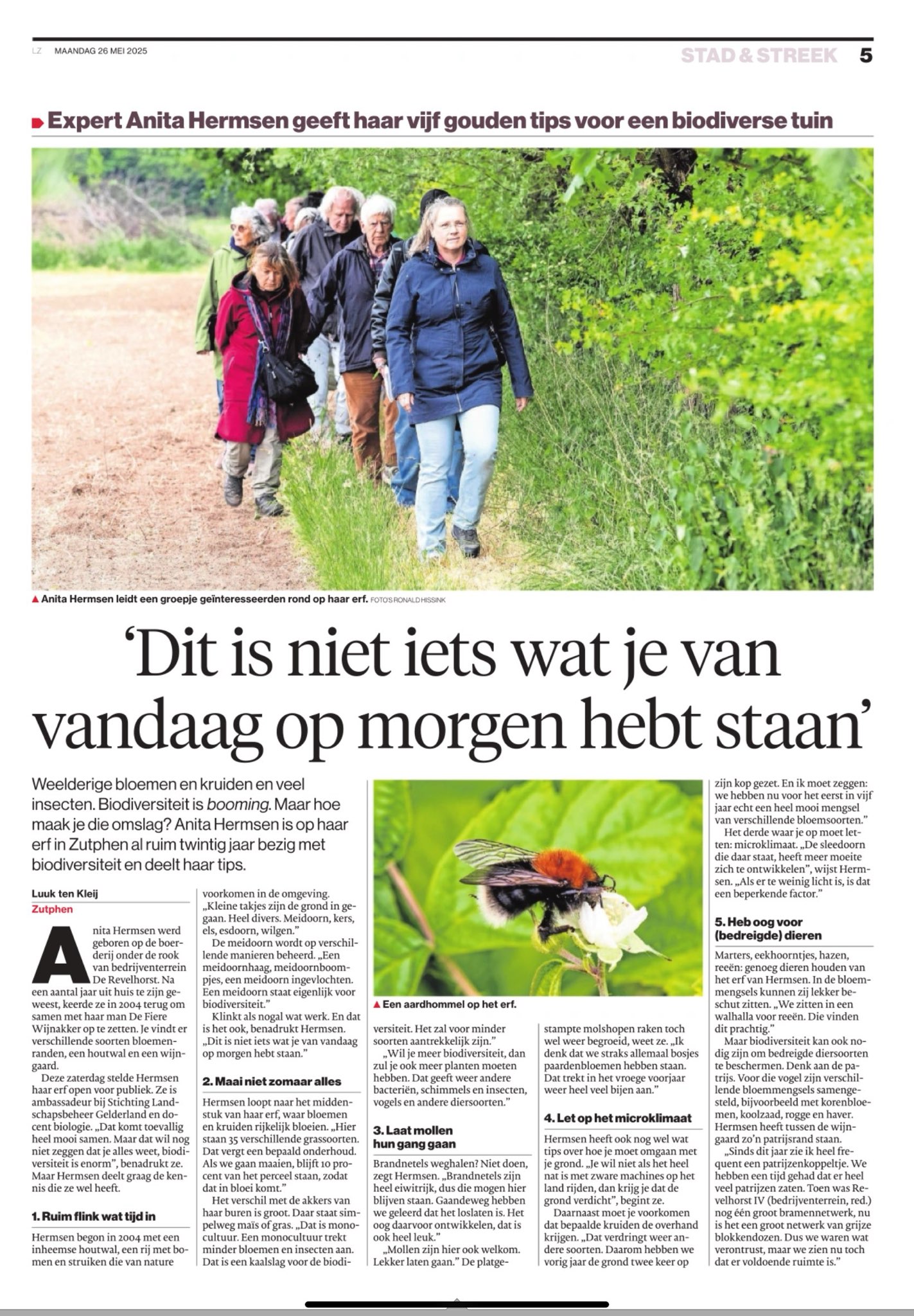 Op de site van Stichting Landschapsbeheer Gelderland staat een mooi geschreven portret van Anita. En in de Stentor staat een verslag met 5 tips voor meer biodiversiteit, Klik op de afbeelding voor een vergroting.