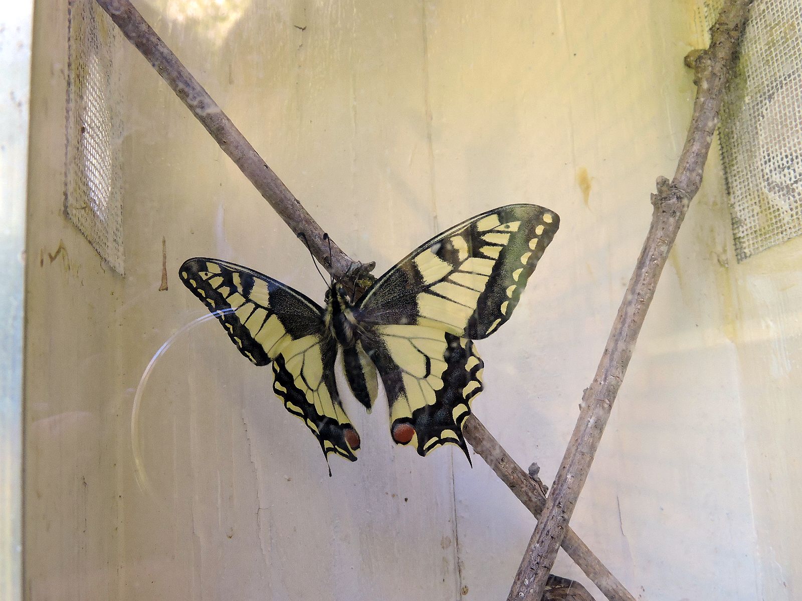 2 dagen later zat er een vlinder op de stok waaraan de pop zich had gehecht. Helaas waren de vleugels nog niet volgepompt met vocht, ze kon nog niet vliegen.