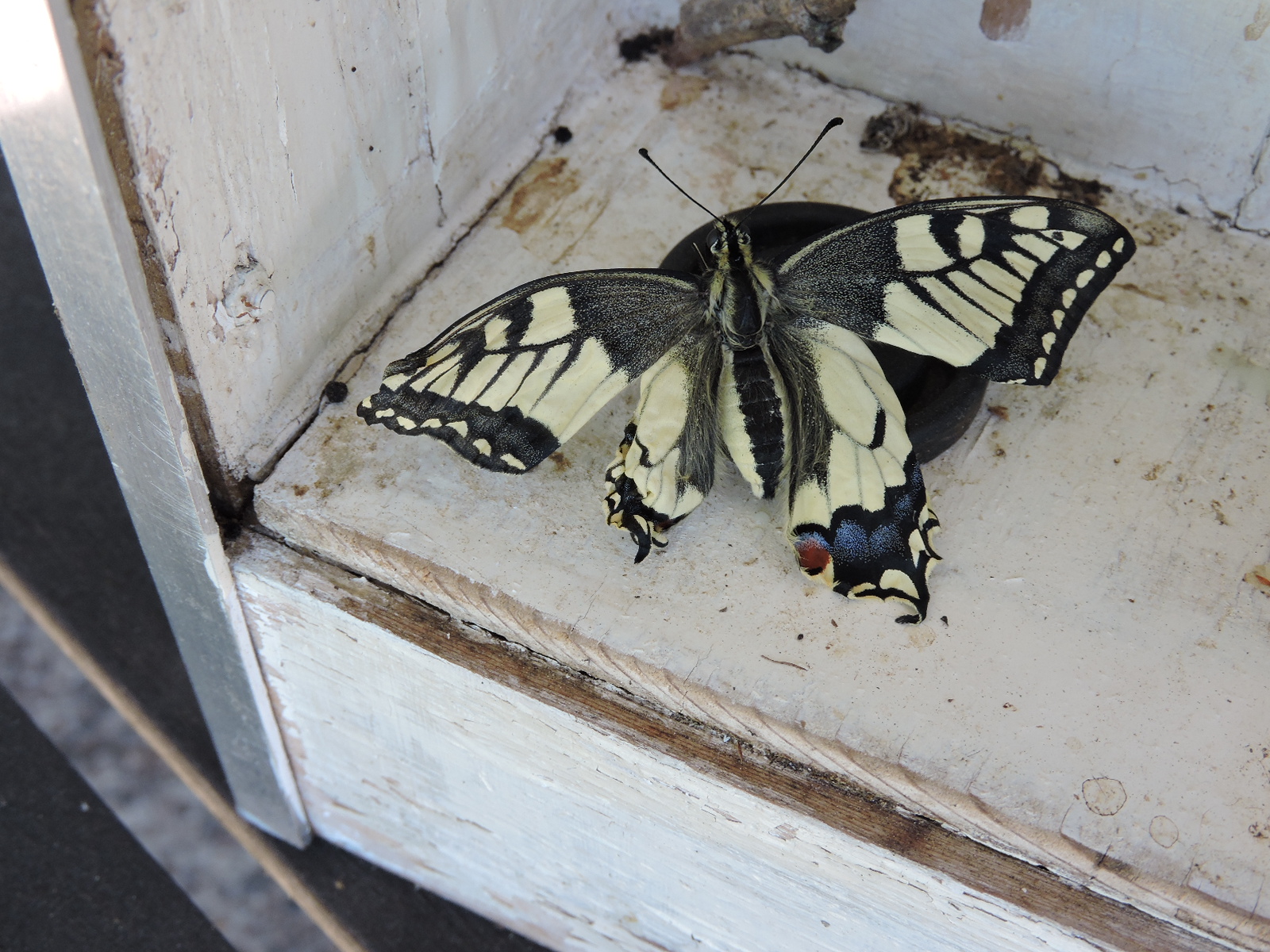 Deze overwinteren buiten en het leek erop dat het met beide poppen goed zou komen. Op 13 mei was de eerste vlinder geboren. Eerst foto’s gemaakt, de buurman laten zien hoe fantastisch ze was en daarna de vrijheid gegeven. Ze vloog meteen heel hoog de lucht in en verdween achter het dak van ons huis. Een aantal dagen later vloog er een volmaakte vlinder in de tuin. Nu was het wachten op de tweede vlinder.
