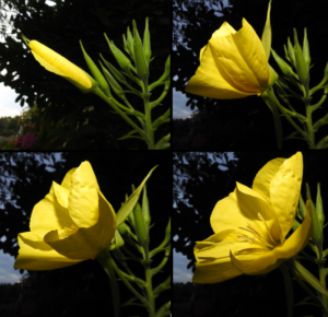 Teunisbloemen komen ’s avonds uit, bloeien in de nacht en de volgende dag. Dat opengaan, geweldig! Ga er op een zomeravond tegen de schemer eens rustig voor zitten en geniet. Het open rollen van de bloem kan in vijf minuten zijn gepiept of wel drie uur duren. Vooral bij hogere temperatuur kan het rap gaan. Het openingsfeest op de foto’s duurde nog geen kwartier. De buitenste blaadjes van de nog in knop zijnde bloem zetten met kleine schokjes een uitvouwende beweging in. Ongeduldig of geen tijd? Met stiekem even blazen kun je dat proces versnellen. Tijdens het opengaan van de bloem komt een onaangename geur vrij. Nou ja, dat vind ik. Die maakt, eenmaal open, plaats voor een prettiger odeur, dat insecten aantrekt. Zo lang het nog donker is nachtvlinders, bij daglicht gevolgd door bijen en hommels.